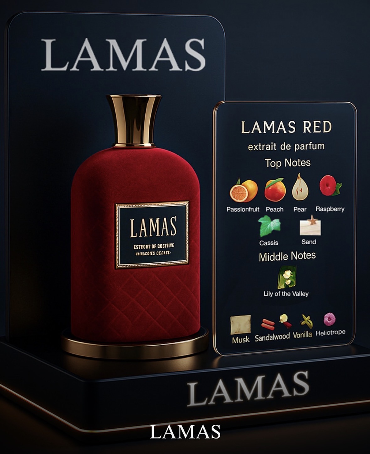 Lamas Red offre une étincelle de musc, de vanille, de bois de santal, de patchouli et d’héliotrope qui jouent avec le fruit de la passion, la pêche, la poire, la framboise, le cassis et le sable.